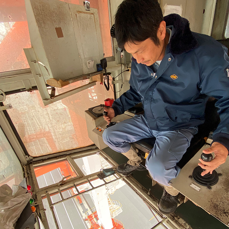 大型荷役機械の運転以外にも、朝はメンテナンス担当者と機械の点検・故障個所の打合せから始まり、午後は元請会社との翌日の人員配置などの打合せを行います。