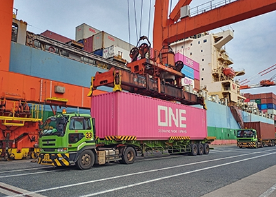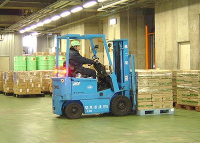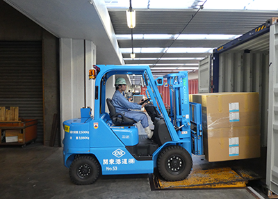 輸入はコンテナヤードに陸揚げされたコンテナから、貨物の特性に合わせて様々な荷役機器や人員を使用することにより、お客様の貨物を出します。出した貨物はドライ倉庫や冷凍倉庫、低温倉庫に蔵置します。また、ニーズに合わせてトラックに出庫します。 輸出は、トラックで入庫された貨物を計画書に合わせてコンテナに詰めます。