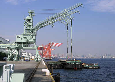 当社は京浜港(大井・青海・本牧ふ頭)においてコンテナターミナル業務を行っています。 岸壁にある「キリン」に似た大型荷役機械「ガントリークレーン」でコンテナ船への貨物積み降ろしを行います。