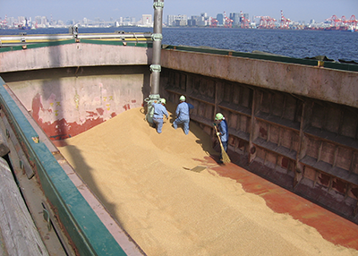 在来船とは貨物の形状によりコンテナで運ぶことが難しいものを運ぶ一般貨物船です。したがって在来船荷役では積込みに多くの人が携わることになります。また荷役作業が天候に左右されるのも特徴です。 当社では主に東京地区で麦を、川崎地区で鋼材を運んでいます。