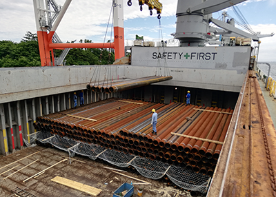 扇島でJFEスチール株式会社の製品であるプレートやコイルを輸出すべく荷役を行っています。船への積み込みは岸壁にある大型クレーンで行います。船内ではフォークリフトによる荷役を行っています。